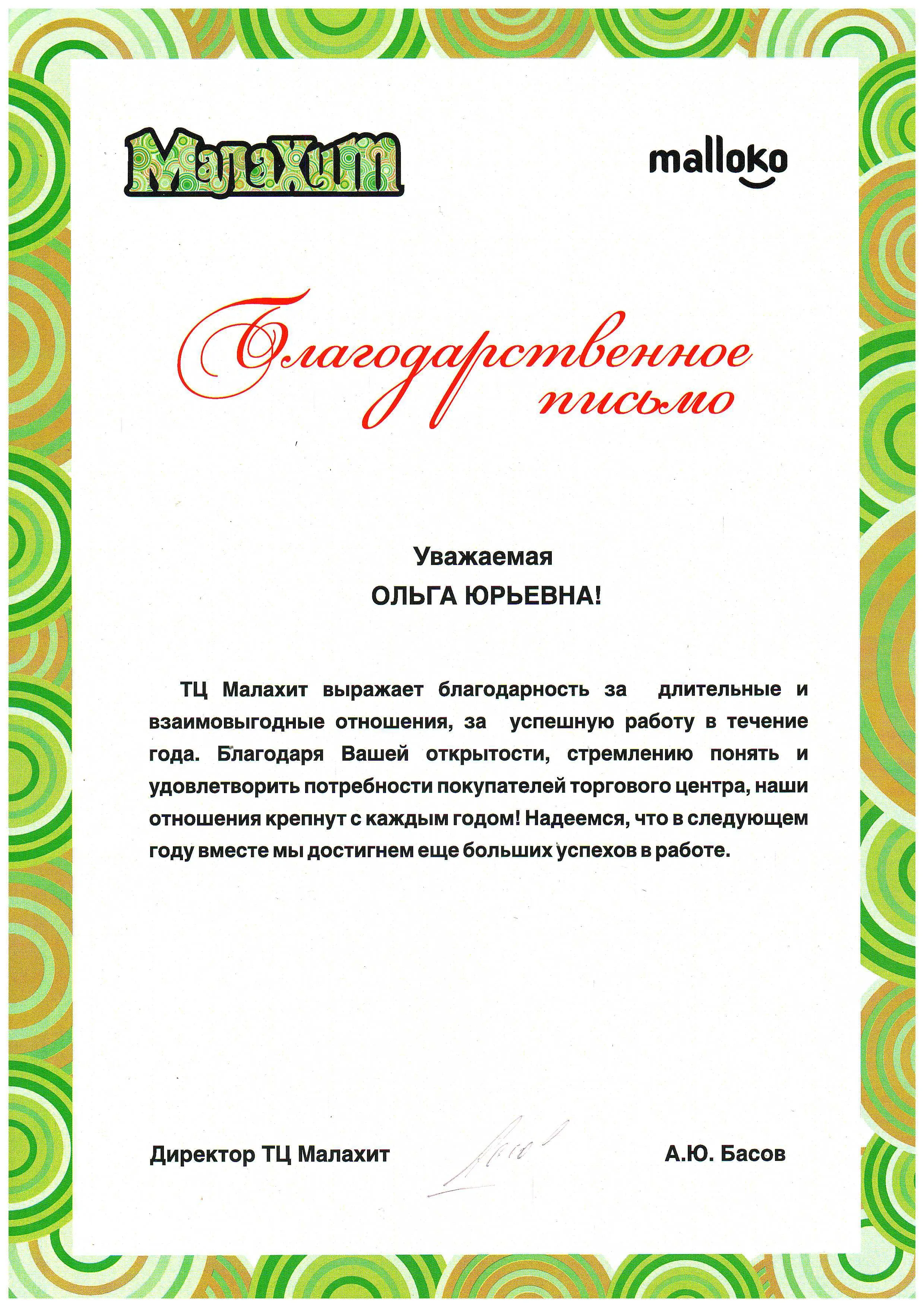 Благодарственное письмо от ТЦ "Малахит" 1.1 мб