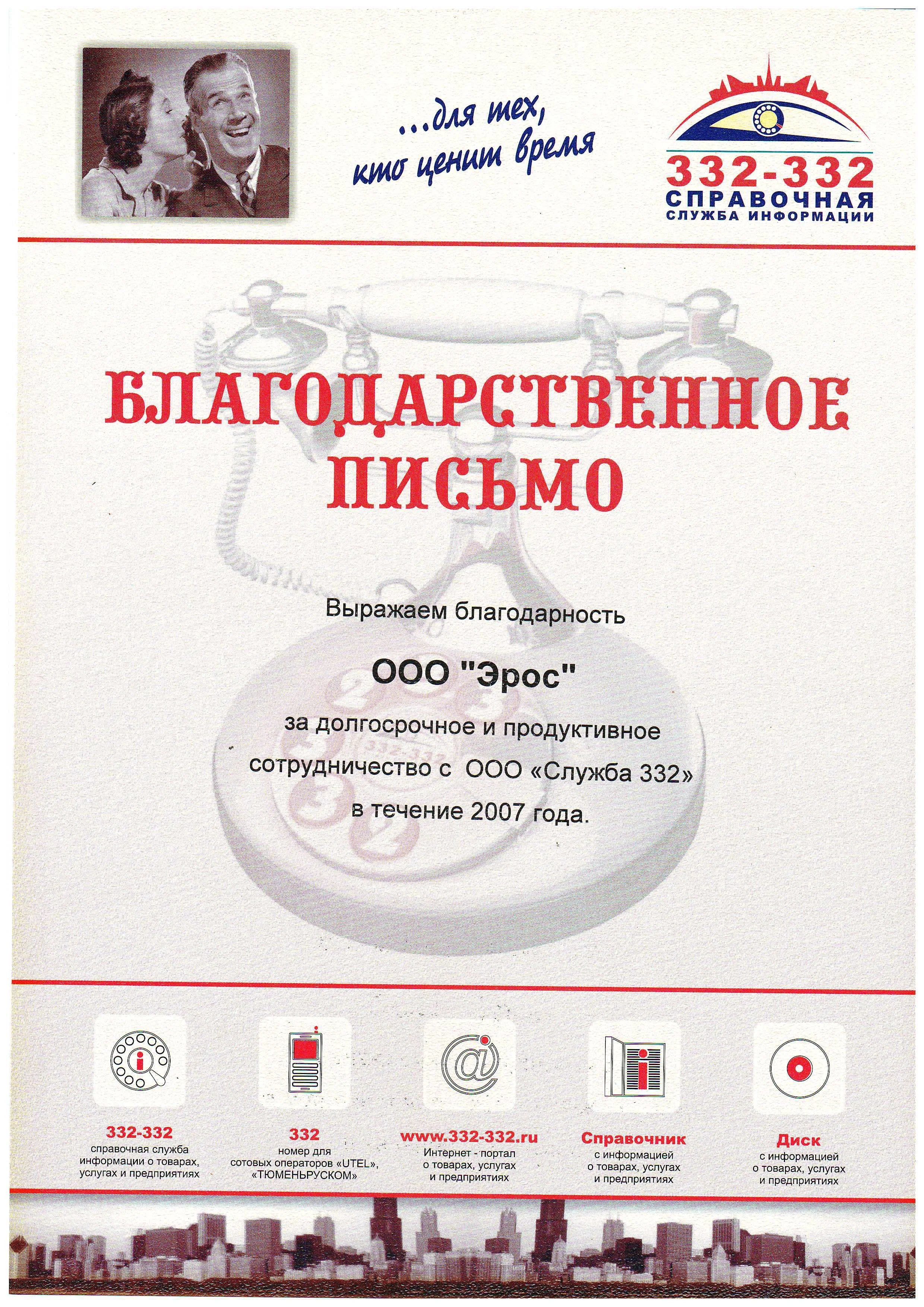 Выражаем благодарность ООО "Эрос" за долгосрочное и продуктивное сотрудничество с ООО "Служба 332" в течении 2007 года.