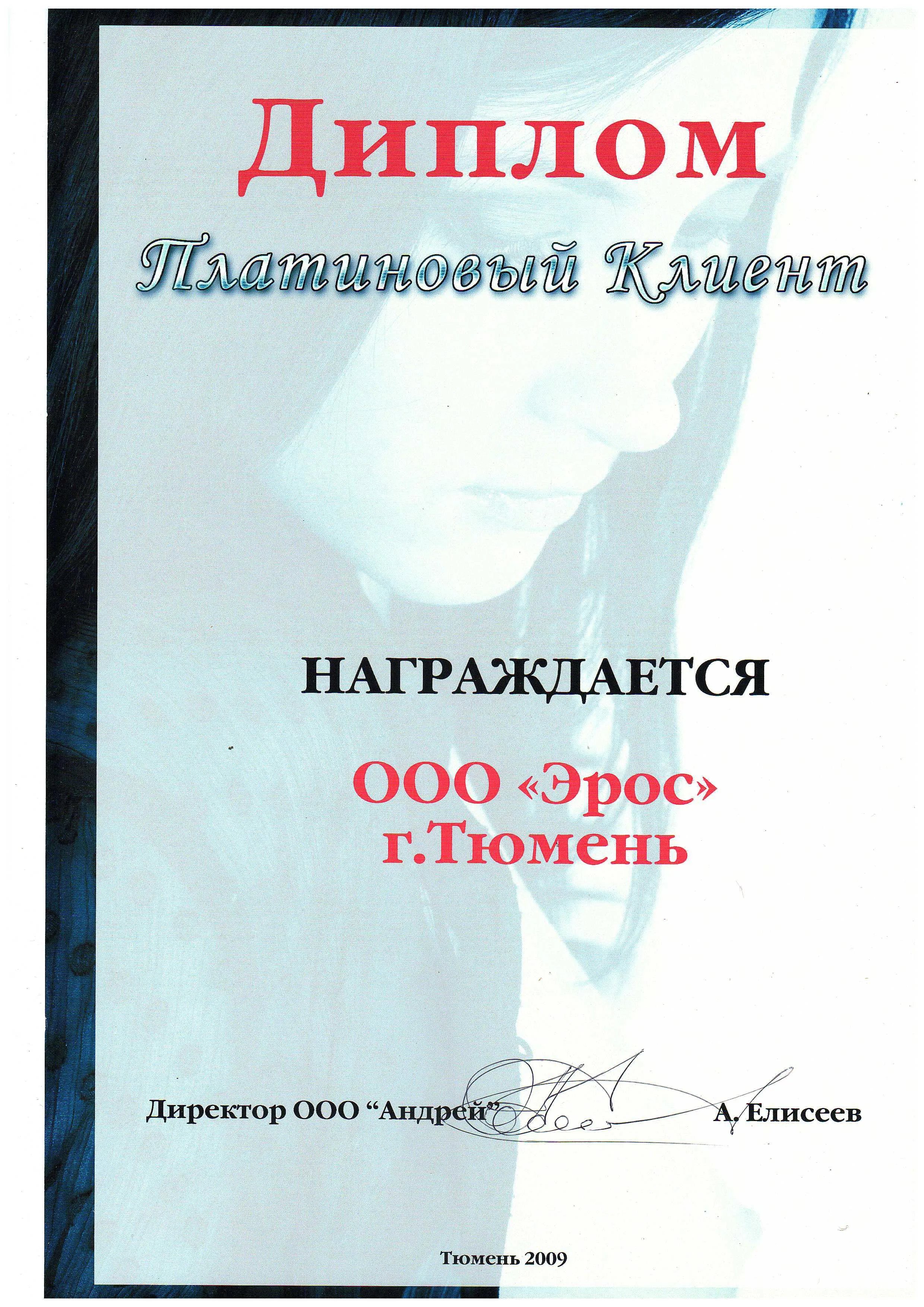 Награждается ООО "Эрос" в номинации Платиновый клиент фирмы "Андрей" по результатам 2009 года.