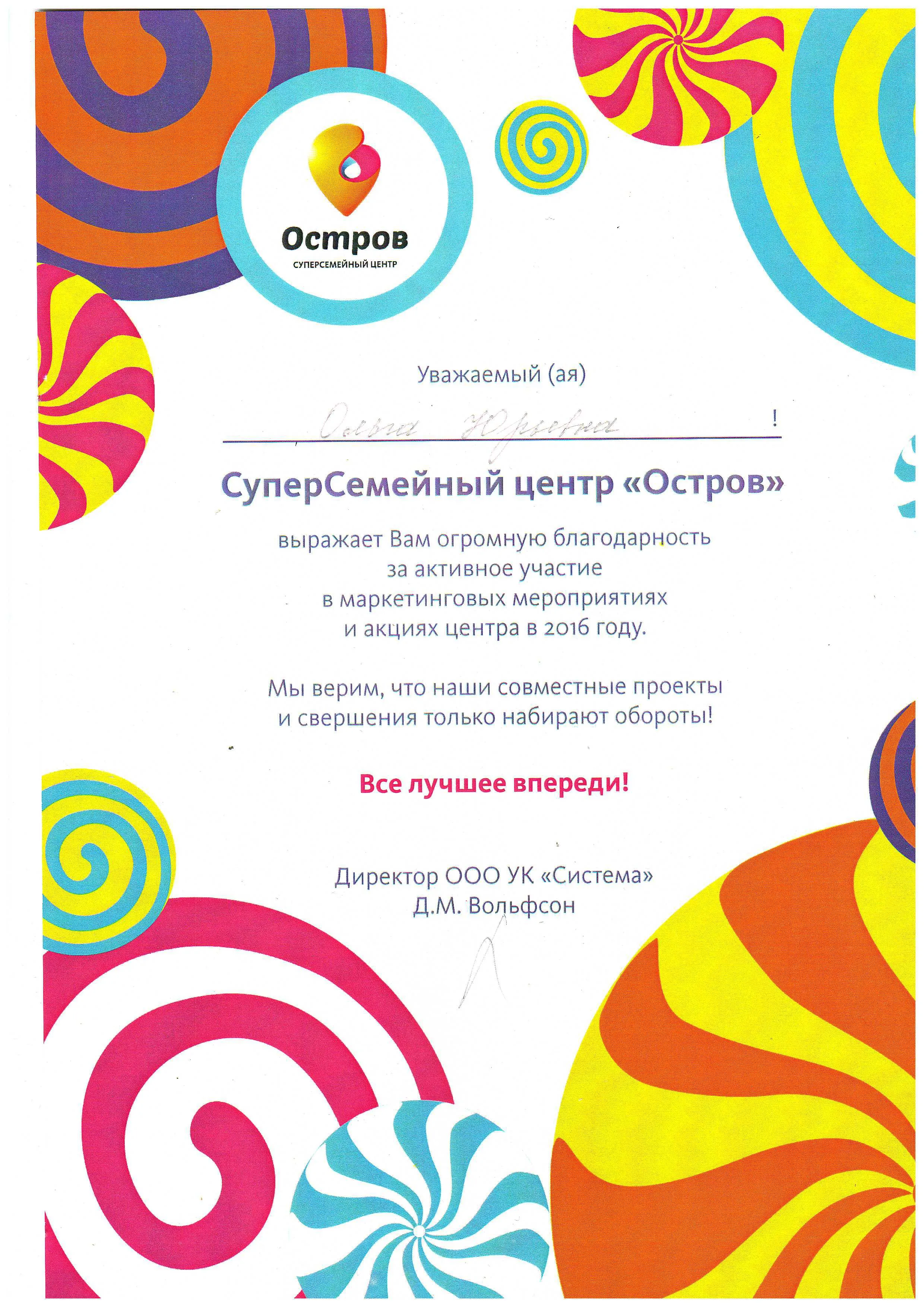 СуперСемейный центр "Остров выражает огромную благодарность за активное участие в маркетинговых мероприятиях и акциях центра в 2016 году.