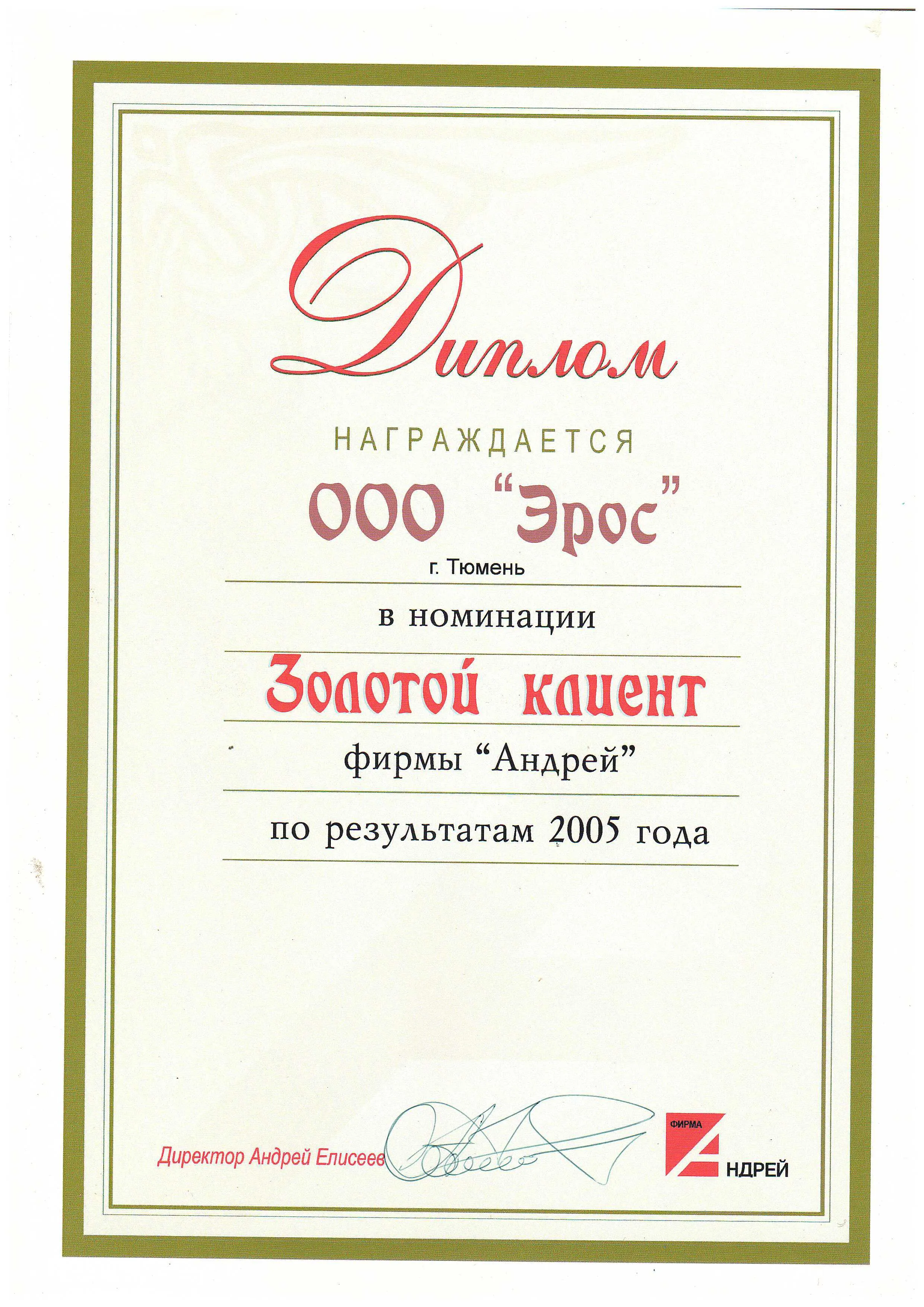 Награждается ООО "Эрос" в номинации Золотой клиент фирмы "Андрей" по результатам 2005 года.