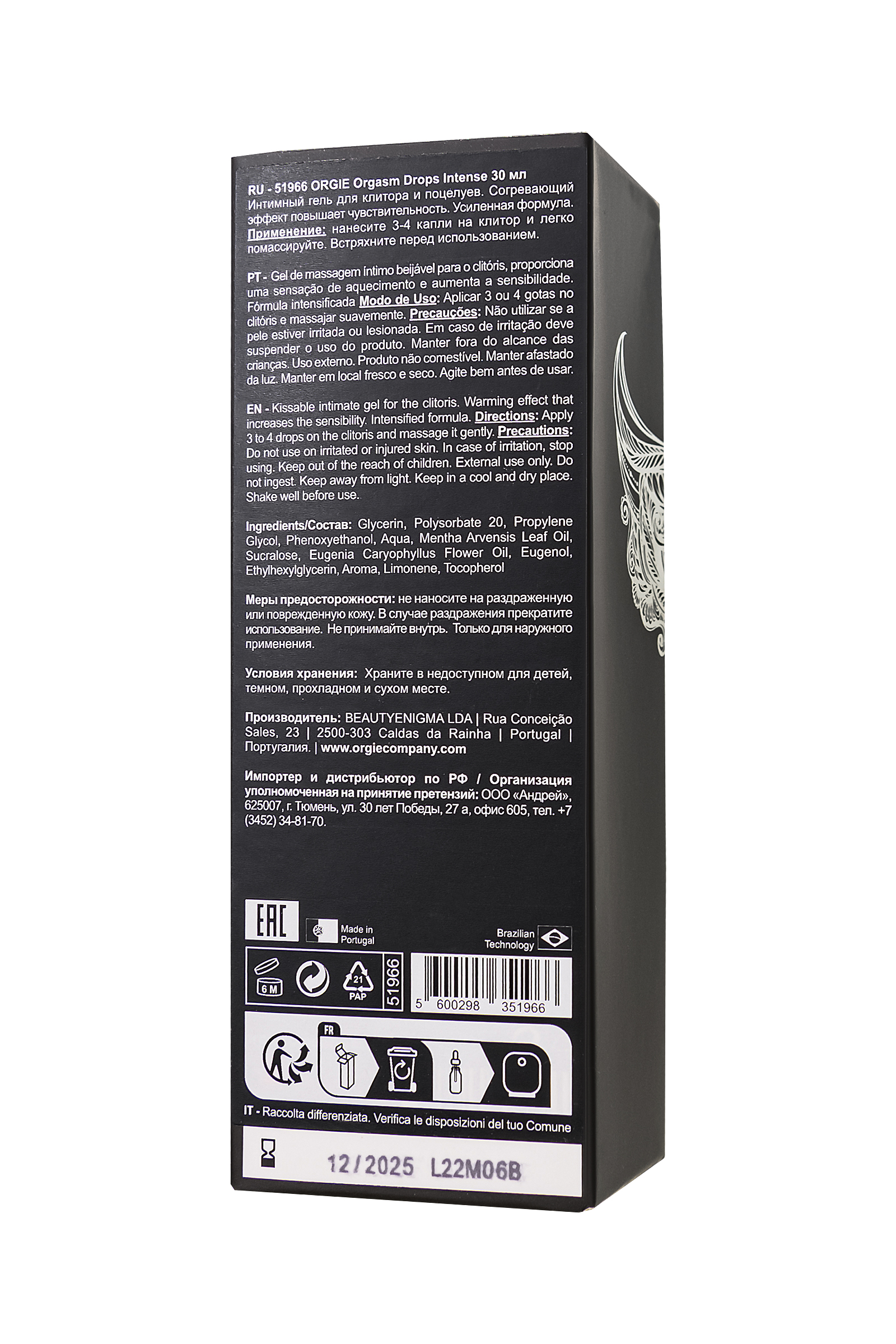 Экстремально возбуждающие капли для клитора Орджи Orgasm Drops Intense открывают мир интенсивных ощущений! Orgasm Drops Intense - усиленная формула, созданная специально для повышения ощущения тепла и чувствительности клитора. Экстремальная стимуляция клитора погружает в усиленное согревание и увеличивает чувствительность клитора на максимум. Ощущения, которые вы испытаете, приведут вас к невероятному возбуждению и ярким оргазмам. Подарите себе сладкое удовольствие с ярким вкусом красного яблока, который сделан с новой формулой без следов гвоздики, чтобы вы могли наслаждаться каждой каплей. Как использовать капли Orgasm Drops Intense? Просто нанесите 2 или 3 капли непосредственно на клитор, проведите нежный массаж и дайте несколько минут волшебству раскрыться. Легкое охлаждение вначале, затем интенсивное согревание. При оральных ласках ощущения становятся еще более многогранными. Для более деликатного воздействия не превышайте дозировку - 1 капля. Orgie уважает ваши чувства и комфорт, и поэтому рекомендует начинать знакомство с продуктом с одной капли. Роскошный стеклянный флакон с капельницей позволяет контролировать расход средства. Объем 30 мл рассчитан приблизительно на 150 доз.