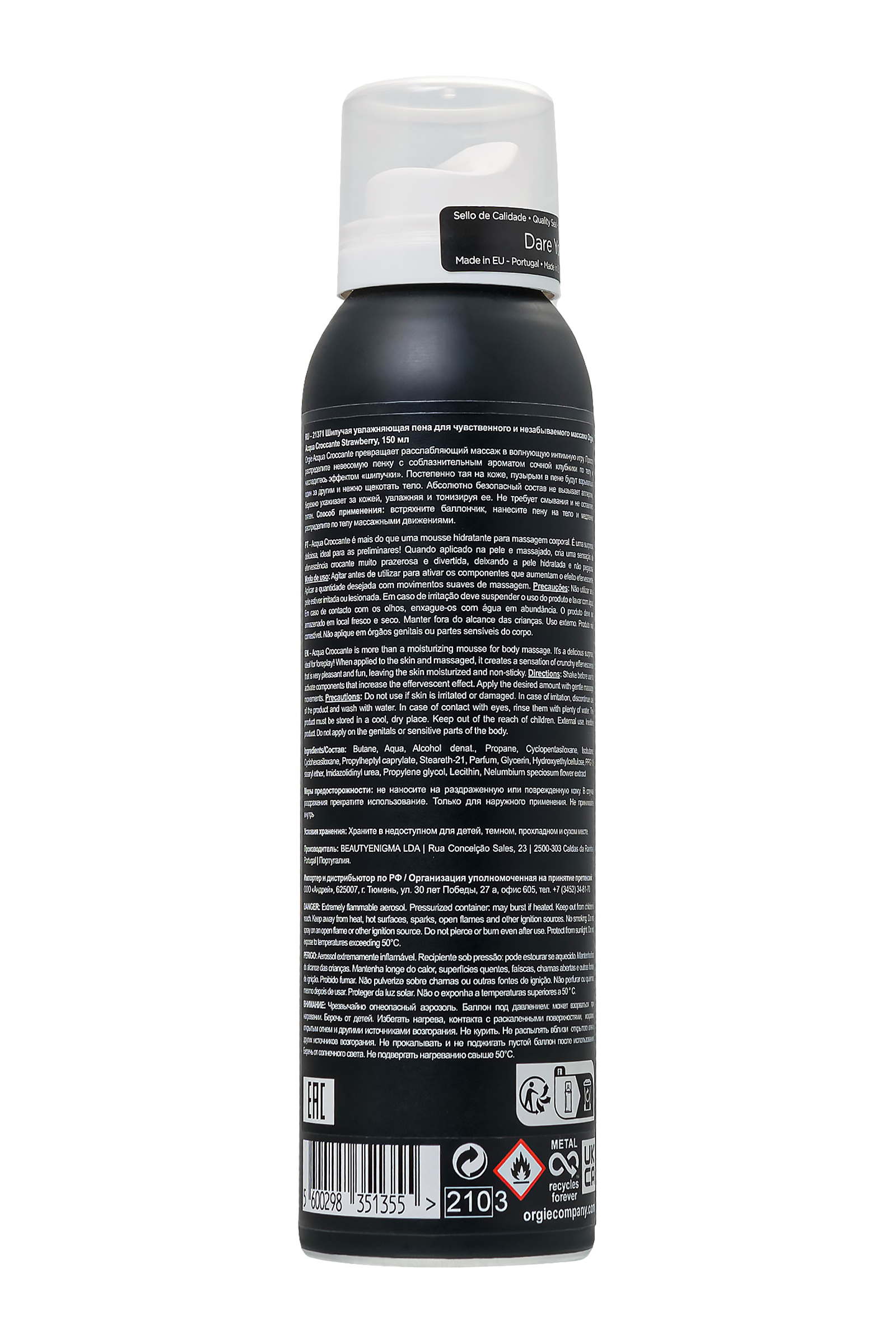 Удивите своего партнера незабываемым массажем! Орджи Acqua Croccante - это увлажняющая и шипучая пена с восхитительным ароматом клубники, который при нанесении на кожу и под мягким давлением ваших рук вызывает взрыв маленьких пузырьков, которые находятся в пене, доставляет уникальный, суперзахватывающий и приятный опыт.Способ применения: Встряхните перед использованием, чтобы активировать компоненты шипучего эффекта. Нанесите необходимое количество на тело массажными движениями.