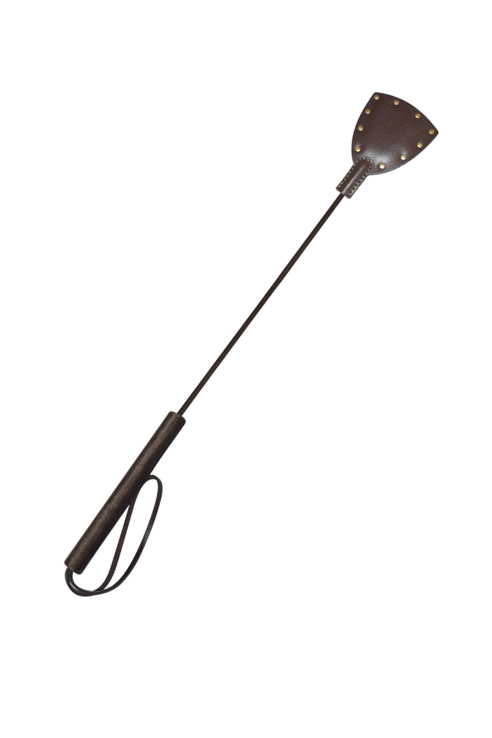 Стек из серии Готика представлен в виде роскошного, изящного изделия цвета темного шоколада. Основательная хлопушка стека изготовлена из натуральной кожи высокого качества и украшена большим количеством клёпок. Хлопушку и рукоять соединяет упругий, но прочный хлыст. Комфортное использование девайса обеспечивает бархатистая рукоять, покрытая велюровой тканью. Ремешок-петля, находящийся на рукояти, позволяет дополнительно фиксировать стек на запястье.ксировать стек на запястье.